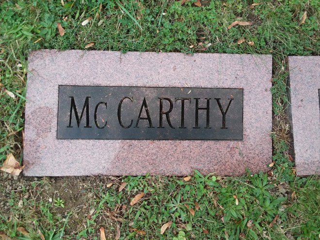 I walked up a steep little incline to what looked like an open space and there I saw 4 flat stones. One that said “McCarthy,” one that said “Quirk” (his daughter Mary’s married name), and one each for his son Dennis and Dennis’ wife Anna. And that was it. I wandered more, wondering if I was missing the others. But I wasn’t. They weren’t there. I admit that I became a little emotional when I realized that Matt’s grave wasn’t specifically marked. He was so important to Jack, so important to my story, that it felt unfair. I wanted him to have more.